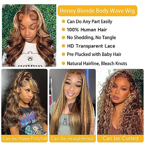 Honey Blonde Lace Front Wig Human Hair Size: 13×4 HD Transparent Lace Front Wigs Human Hair Pre Plucked Bleached Knots, Suitable for All Skin, Natural Hairline with Baby Hair, Highlight Frontal Wigs Can Do Middle Part, Side Part