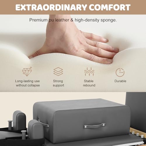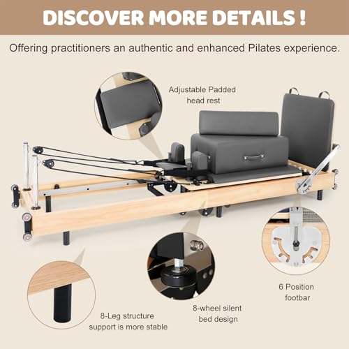 Comfortable Design for Body Exercise: It has a padded back platform, an adjustable headrest and high-density foam shoulder rests to comfort you as you tackle exercises. Two-position headrest further ensures a perfect fit. Moreover, accessories include the Reformer box, jump board and foot straps as auxiliary tools, enhancing training and adding challenges.