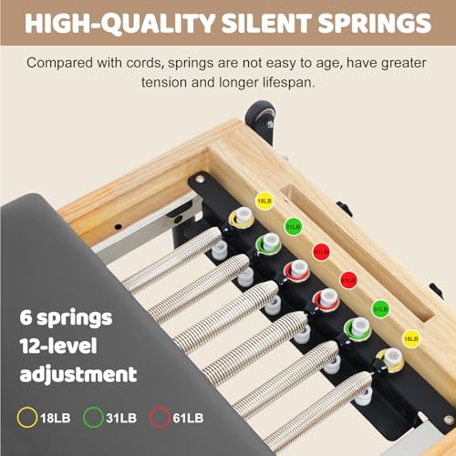 6 Adjustable Resistance Levels: The Pilates machine features 6 music wire springs, providing 12 adjustable settings. Users can select from 3 tension options: 2 strong springs (Red), 2 medium springs (Green), and 2 light springs (Yellow). It allows personalized workouts focusing on various muscle groups to cater to different fitness levels.