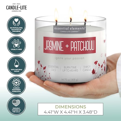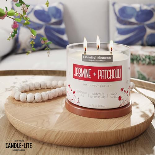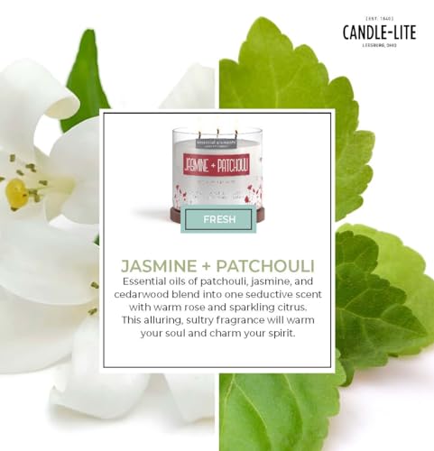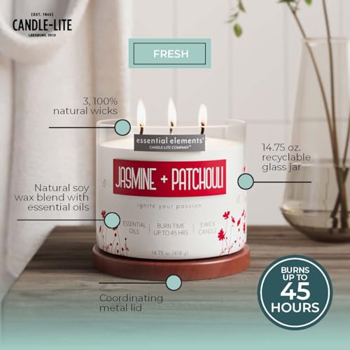 Essential Elements by Candle-lite Scented Candles, Jasmine & Patchouli Fragrance, One 14.75 oz. Three-Wick Aromatherapy Candle with 45 Hours of Burn Time, Off-White Color